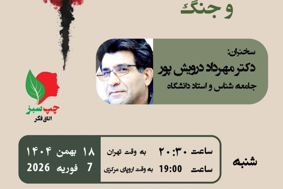 در سمینار شانزدهم اتاق فکر چپ سبز، دکتر مهرداد درویشپور، استاد جامعهشناسی، به یکی از حیاتیترین و بحثبرانگیزترین موضوعات روز یعنی «نسبت جمهوریخواهان و مسئله جنگ» میپردازد. در فضای پس از سرکوبهای خونین اخیر و در حالی که سایه جنگ بیش از هر زمان دیگری بر سر ایران سنگینی میکند، این گفتار به بررسی امکانسنجی… ادامه »سمینار شانزدهم، جمهوری خواهان و جنگ